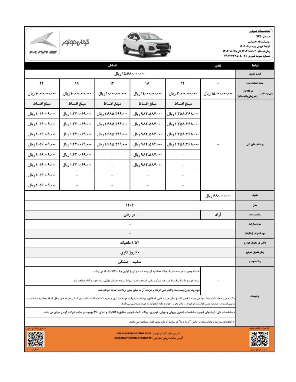 به گزارش پایگاه خبری «عصر خودرو»، در این طرح، خریداران نقدی KMC SR3 از تخفیف 68 میلیون تومانی بهرهمند خواهند شد. کراس اوور KMC SR3 در قالب شرایط اقساطی 12، 18 و 24 ماهه نیز عرضه میشود که میزان پیشپرداخت آن بسته به مدت اقساط متغیر است. تاریخ اولین چک اقساط 20 آذر 1404 و موعد تحویل خودرو 60 روز کاری اعلام شده است.