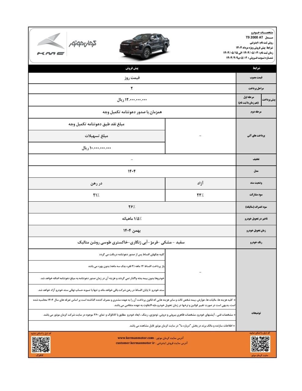 شرایط پیشفروش KMC T9 با مبلغ پیشپرداخت یک میلیارد و 200 میلیون تومان با موعد تحویل بهمن 1404 اعلام شده است. سود مشارکت سالیانه برای متقاضیان 24 درصد و همچنین امکان استفاده از تسهیلات تا یک میلیارد تومان با بازپرداخت 12 ماهه در دسترس خواهد بود.