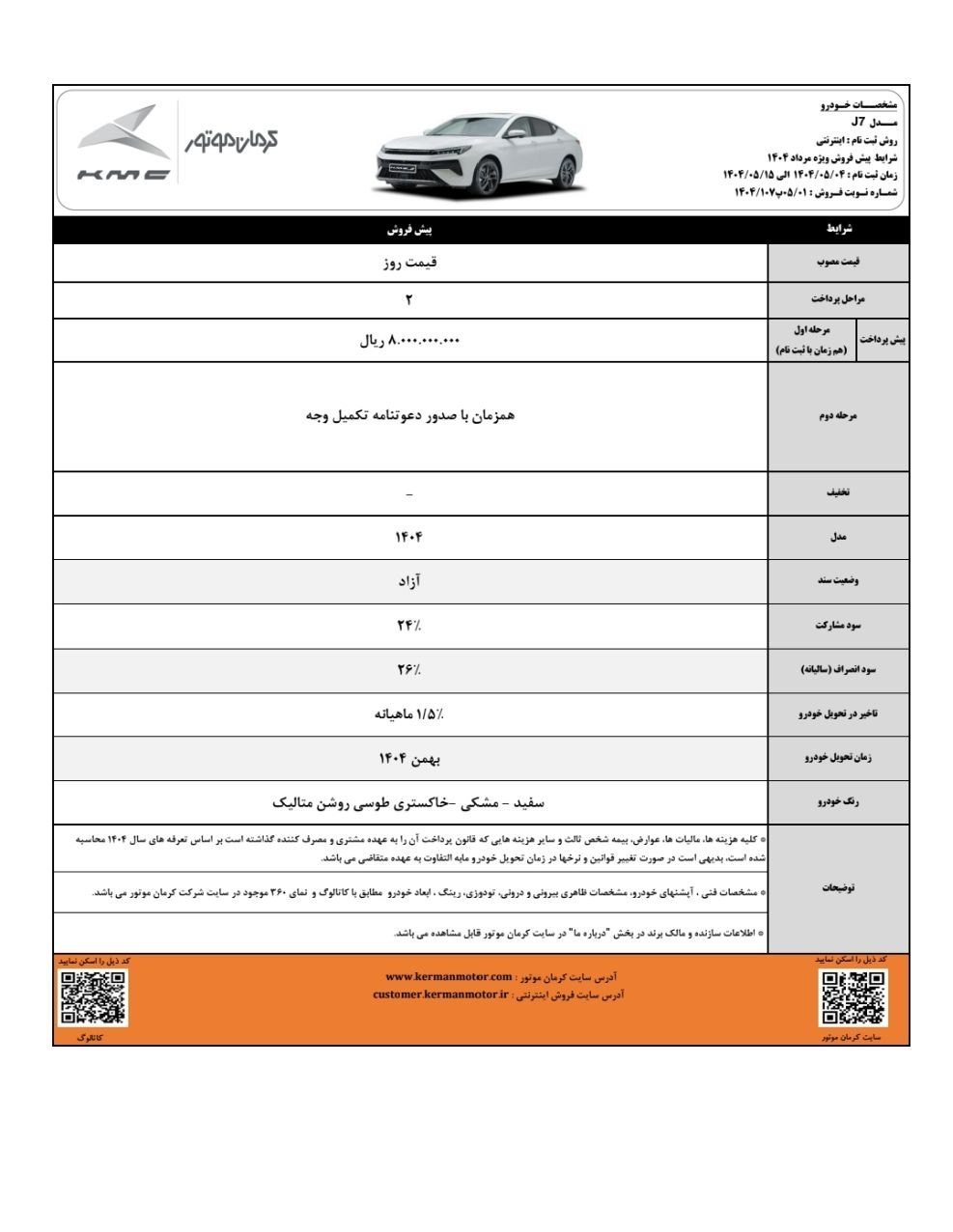 سدان محبوب کرمان موتور در شرایط پیش فروش نیمه اول مرداد 1404 با مبلغ پیش پرداخت 800 میلیون به فروش میرسد. موعد تحویل خودرو بهمن 1404 اعلام شده و سود مشارکت سالیانه 24 درصد است.