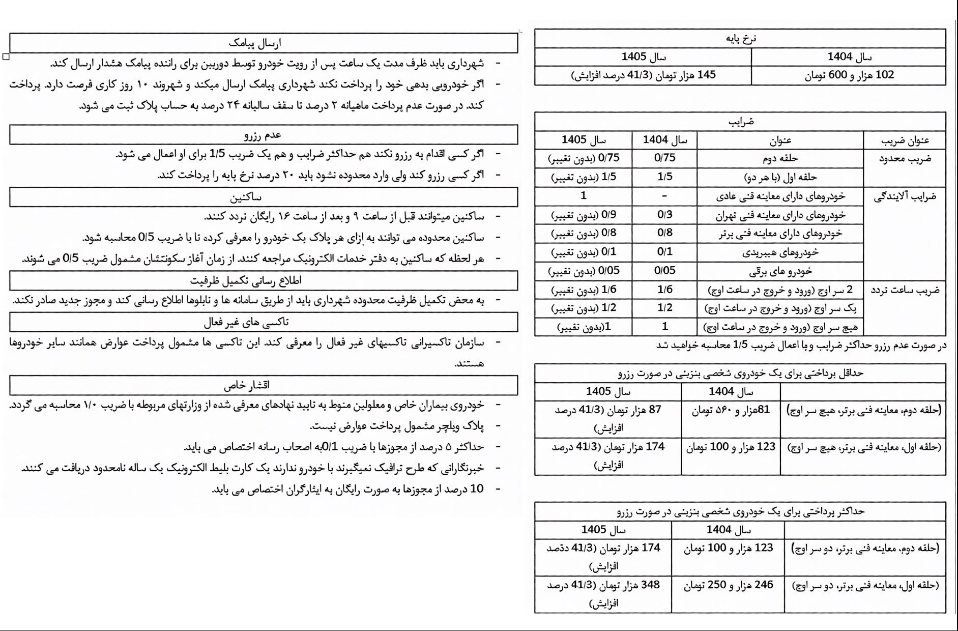 در جلسه اخیر شورا، اعضا ضمن بررسی پیشنهادهای ارائهشده از سوی شهرداری تهران، درباره تعرفههای جدید عوارض ورود به محدوده طرح ترافیک برای سال آینده و چارچوب اجرایی آن به بحث و تبادل نظر پرداختند. در نهایت، نرخها و مقررات پیشنهادی پس از اعمال اصلاحات لازم، به تصویب رسید. جزئیات مربوط به تعرفههای مصوب و ضوابط اجرایی، در جداول زیرا قابل مشاهده است.