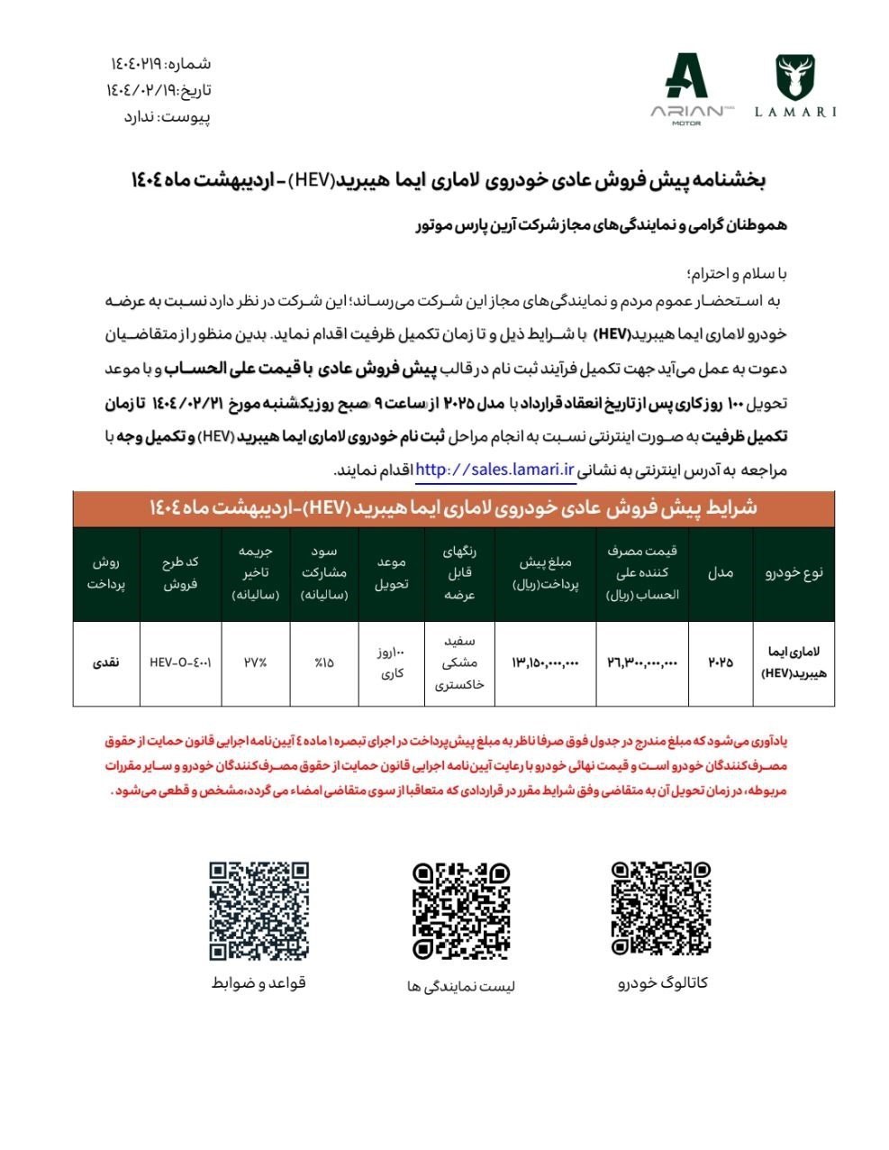 عصر خودرو- شرکت آرین پارس موتور از آغاز پیشفروش خودروی لاماری ایما هیبرید (HEV) مدل ۲۰۲۵ خبر داد. این طرح از ساعت ۹ صبح روز یکشنبه ۲۱ اردیبهشت ۱۴۰۴ بهصورت اینترنتی شروع شده و تا تکمیل ظرفیت ادامه خواهد داشت.