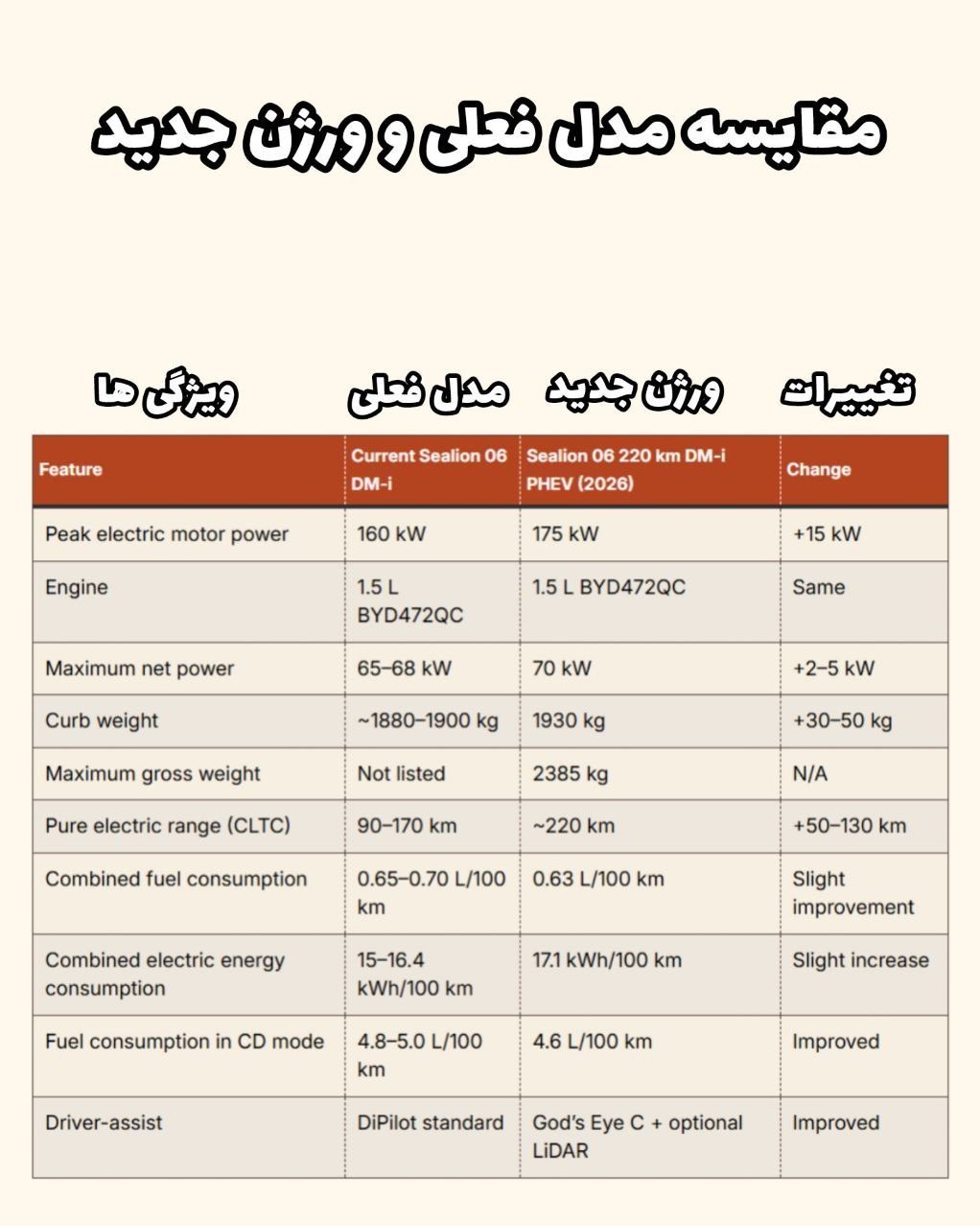 عصر خودرو- شرکت BYD اعلام کرد که در اوایل سال ۲۰۲۶ نسخه جدید و آپدیت شده کراساوور پلاگین هایبرید Sealion ۰۶ DM-i را به بازار عرضه میکند. نسخه جدید به یک موتور بنزینی ۱.۵ لیتری از نوع BYD۴۷۲QC و یک موتور الکتریکی با ۱۷۵ کیلووات معادل ۲۳۸ اسببخار قدرت مجهز است. سیستم کمک رانندگی God's Eye C همراه با LiDAR هم به عنوان آپشن قابل سفارش خواهد بود.