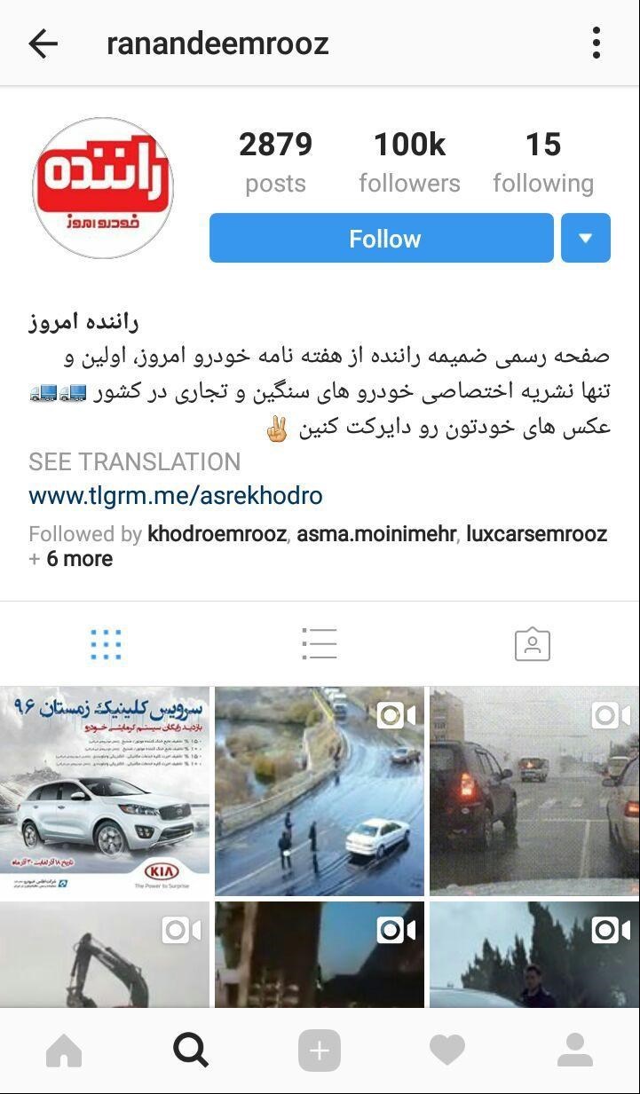 عصر خودرو- اینستاگرام "راننده" به عنوان صفحه تخصصی خودروهای کار و تجاری بازار ایران و جهان و صفحه رسمی ضمیمه راننده هفته نامه خودروامروز در اینستاگرام ساعتی قبل از مرز ۱۰۰هزار دنبال کننده گذشت.