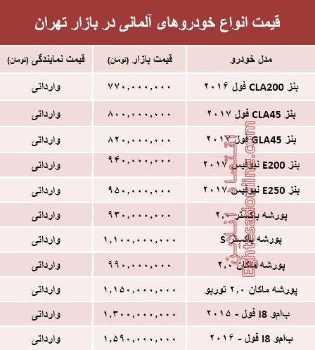 به گزارش پایگاه خبری«عصر خودرو» به نقل از اقتصادآنلاین، آنچه در زیر میآید قیمت روز انواع خودروهای آلمانی در سطح بازار پایتخت طی اسفند ماه 96 است که ممکن است تا 5 درصد در مناطق مختلف تهران دارای نوسان باشد.