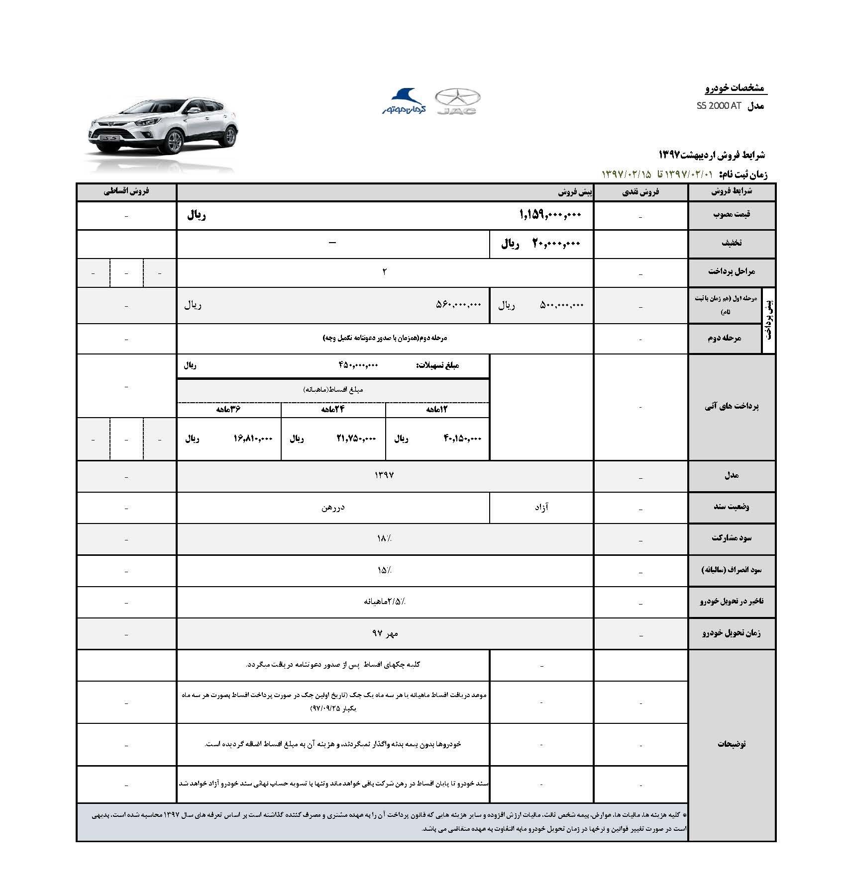به گزارش پایگاه خبری «عصر خودرو» ، این پیش فروش دارای دو طرح است که خریداران در طرح اول با پرداخت 50 میلیون تومان مبلغ 2 میلیون را از شرکت تخفیف خواهند گرفت و الباقی مبلغ را با صدور دعوتنامه پرداخت خواهند کرد.