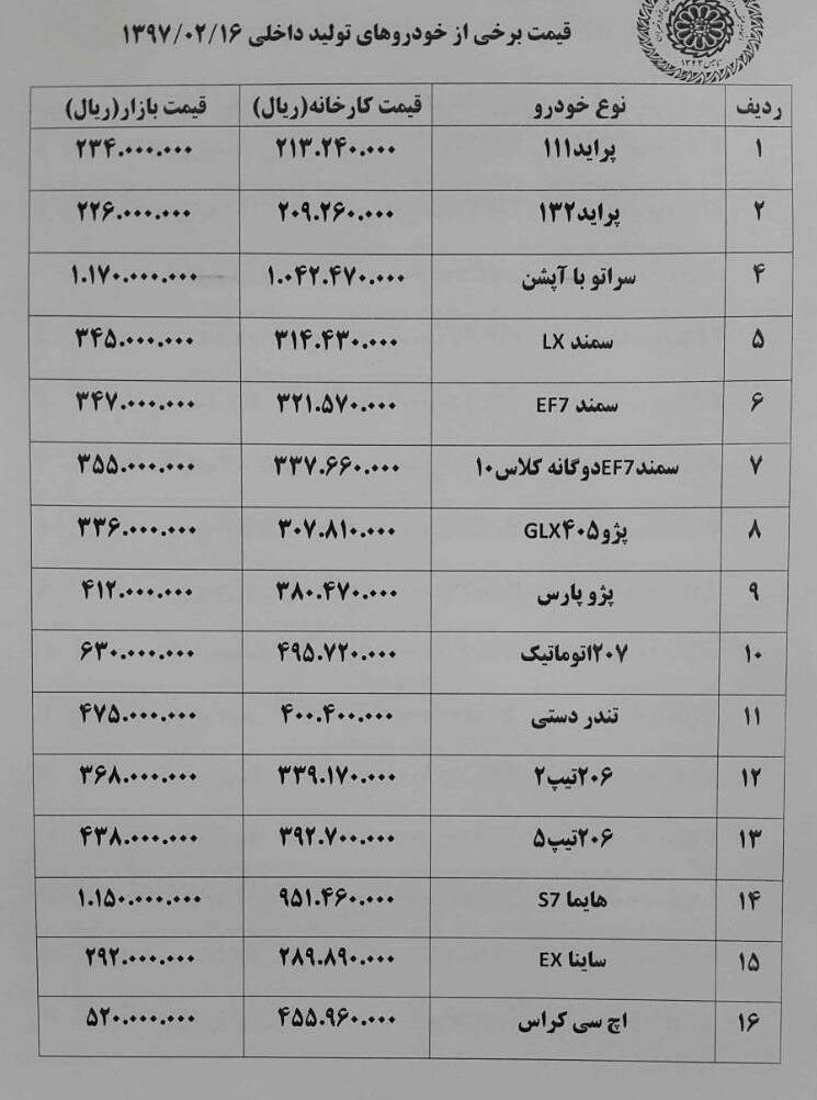 قیمت تعدادی از خودروهای داخلی در بازار امروز به شرح زیر است: