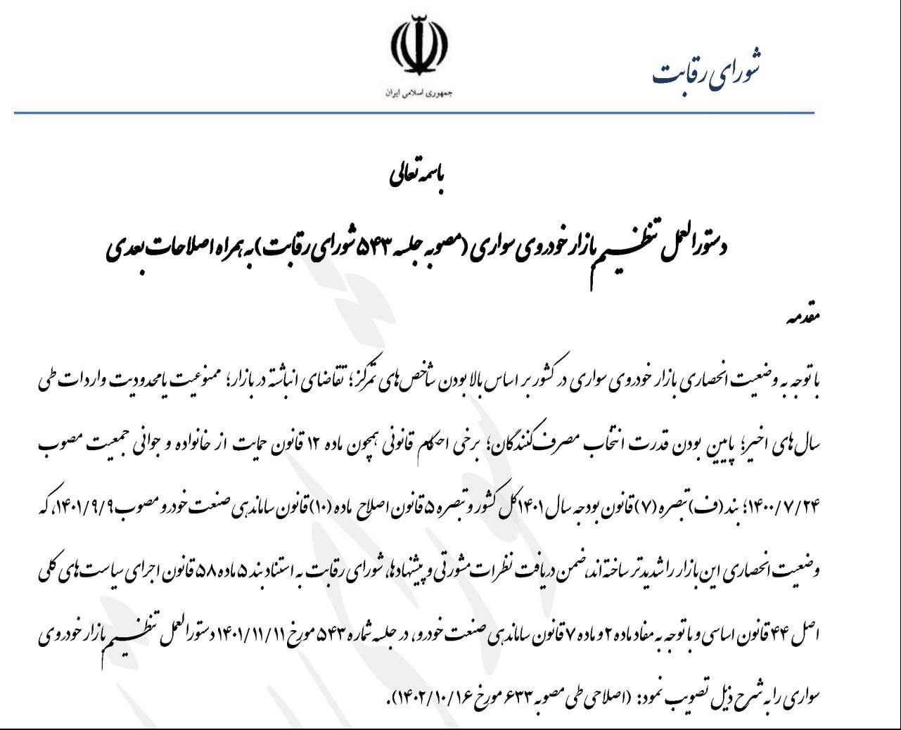 عصر خودرو- دستورالعمل تنظیم بازار خودروی سواری مصوب جلسه ۵۴۳ شورای رقابت به وزارت صمت ابلاغ شد.