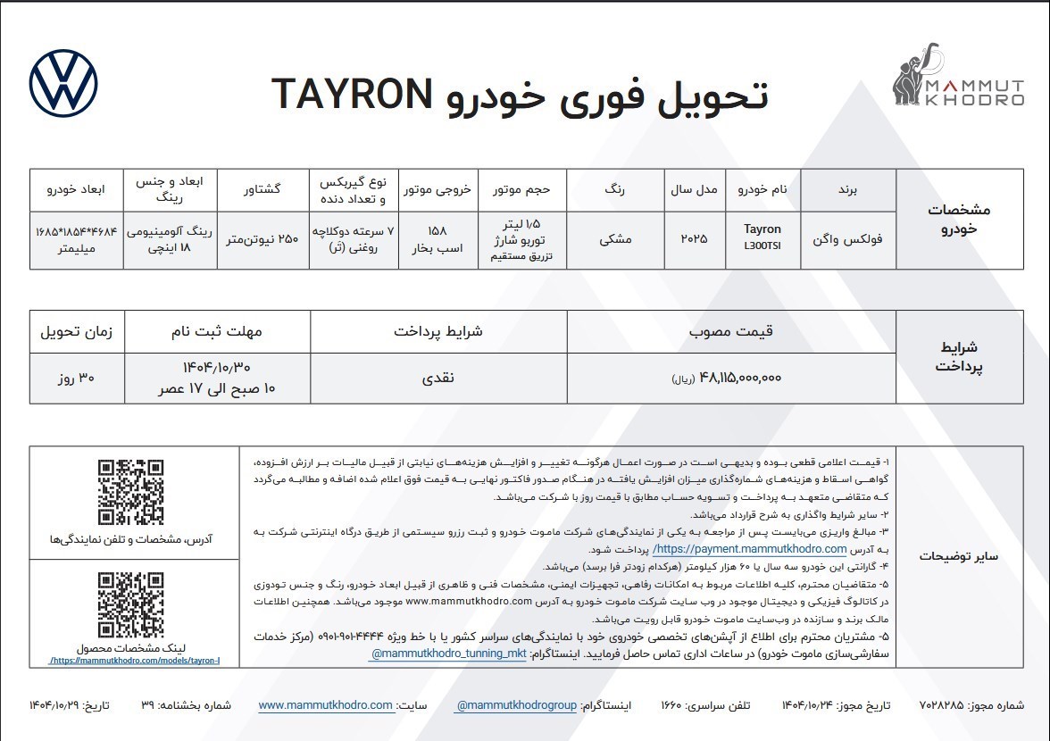 عصر خودرو- ماموت خودرو، واردکننده محصولات فولکس واگن، رسماً ورود فولکس واگن تایرون ( Tayron L) را به بازار ایران اعلام کرد.