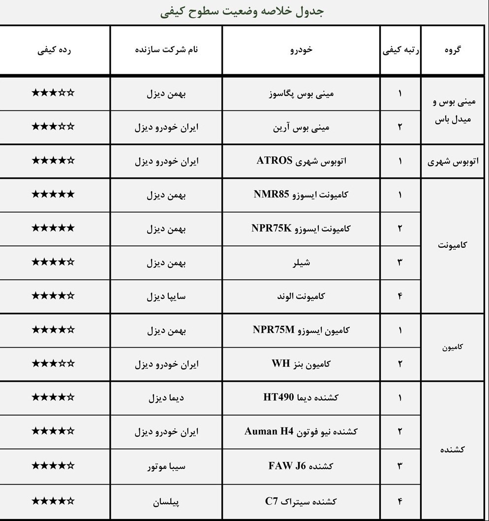 جدول سطوح کیفی خودروهای گروه سبک-بخش وانت