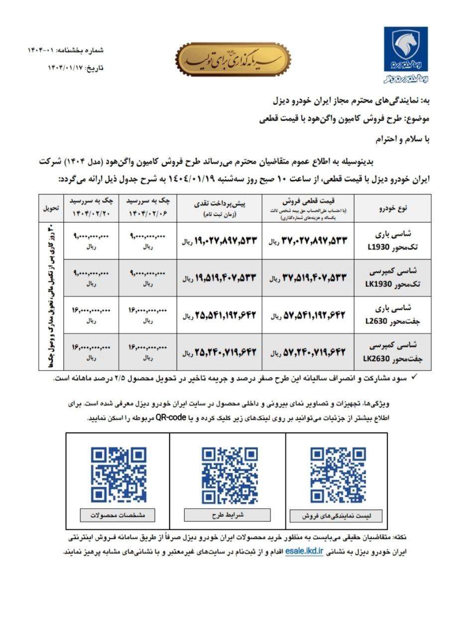 به گزارش پایگاه خبری «عصر خودرو»، شرایط فروش فوری محصولات ایران خودرو دیزل از روز سه شنبه هفته جاری با قیمت قطعی به صورت اینترنتی آغاز خواهد شد.