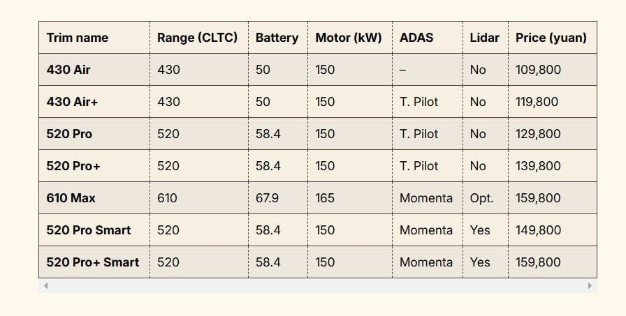 این خودرو داری 3 نوع آپشن باتری LFP با ظرفیت 50 ، 58.4 و 67.9 کیلوواتساعت است که برد مسافت خودرو را به ترتیب 430 ، 520 و 610 کیلومتر تحت شرایط CLTC میرسانند.