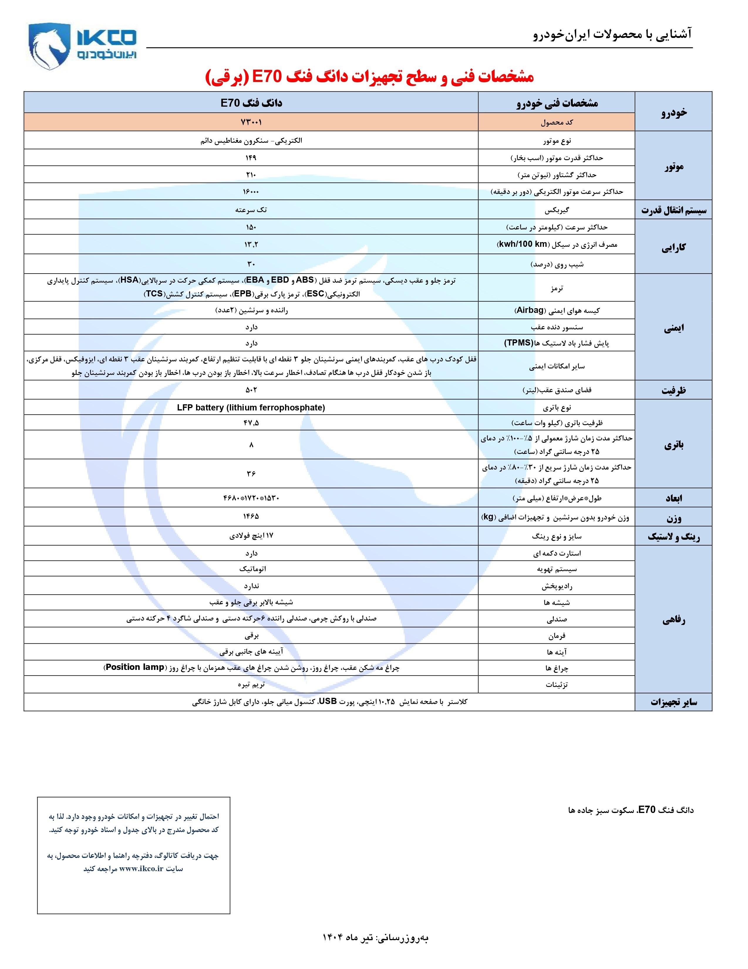 عصر خودرو- دانگ فنگ E۷۰ سدان برقی ایران خودرو است که آخرین قیمت رسمی اعلامی ایران خودرو برای آن یک میلیارد و ده میلیون تومان بوده است.