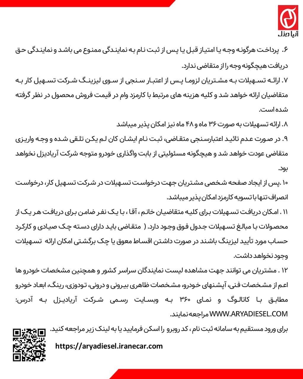 علاقهمندان برای کسب اطلاعات بیشتر میتوانند با شماره تماس 49247-021 داخلی 140 تا 147 واحد فروش آریا دیزل در ارتباط باشند.