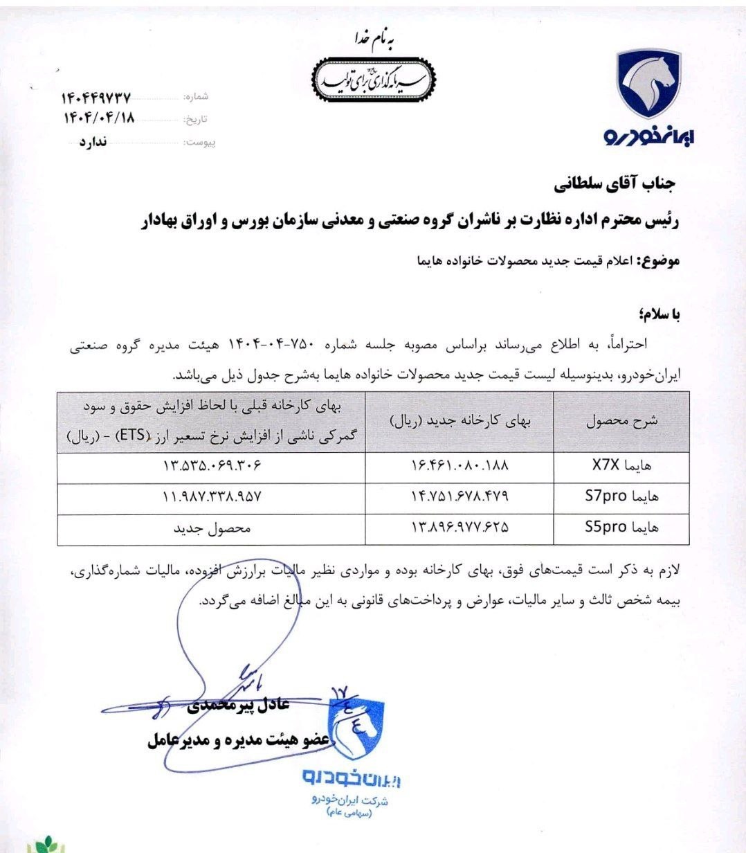 به گزارش پایگاه خبری «عصر خودرو»، براین اساس قیمت هایما x7x به میزان 2.926.010.882 ریال و قیمت S7prp به میزان 2.764.339.522 ریال افزایش یافته است.