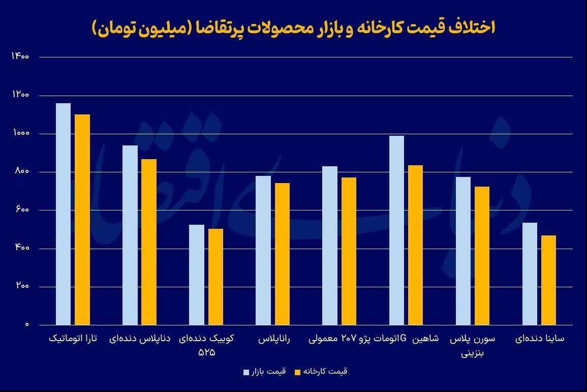 اما حالا وضعیت به کلی متفاوت شده است و بسیاری از خودروها تقریبا در کارخانه نیز تقریبا به قیمت حاشیه بازار فروخته میشوند برای مثال یک دستگاه تارا اتوماتیک در بازار به قیمت یکمیلیارد و 103میلیون تومان فروخته میشود، بهای همین خودرو در بازار یکمیلیارد و 160میلیون تومان است. بنابراین اختلاف قیمتی آن تنها به 57میلیون تومان و 5 درصد میرسد. دناپلاس دندهای رینگ فولادی نیز در کارخانه و بازار به ترتیب 868میلیون تومان و 940میلیون تومان قیمت دارد و اختلاف قیمت آن به 72میلیون تومان و 8.3 درصد میرسد. همچنین کوییک دندهای روز گذشته در بازار 525میلیون تومان خرید و فروش شد اما بهای کارخانه همین خودرو 505میلیون تومان است. بر این اساس در بازار 20میلیون تومان و حدود 4 درصد گرانتر از کارخانه خرید و فروش میشود. این اختلاف قیمت در مورد راناپلاس هم تقریبا ناچیز است. به طوری که بهای رسمی آن 744میلیون تومان و قیمت بازار آن 780میلیون تومان است، پس اختلاف قیمت آن تنها به 36میلیون تومان و 4.8 درصد میرسد.