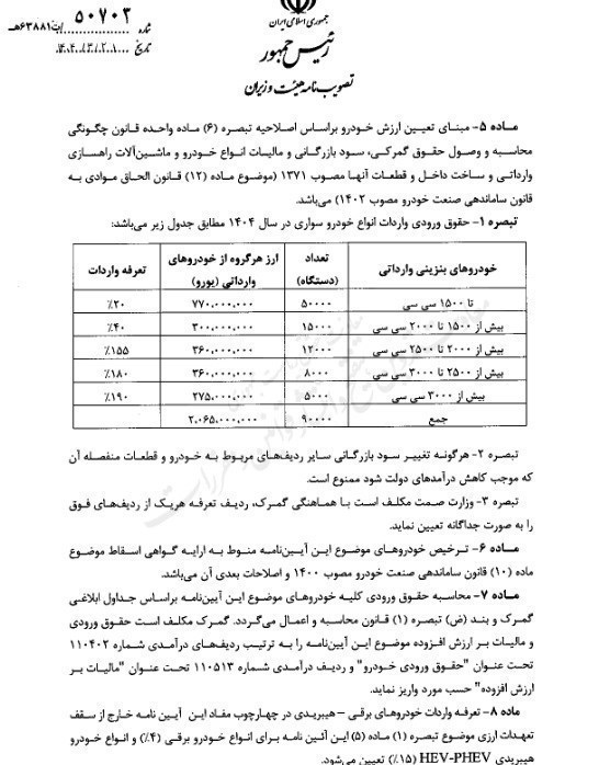 به گزارش پایگاه خبری «عصر خودرو» به نقل از مهر، بخشنامه موضوع ابلاغ تصویبنامه درخصوص اصلاح آیین نامه اجرایی بند ر تبصره یک ماده واحده قانون بودجه سال 1404 کل کشور (موضوع واردات انواع خودرو) ابلاغ شد.