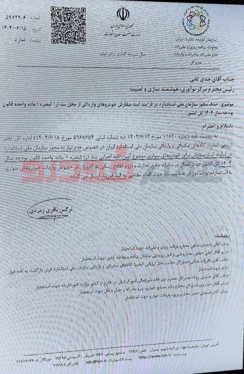 به گزارش پایگاه خبری «عصر خودرو»، بر اساس نامه‌ای که از سوی وزارت صنعت، معدن و تجارت به مرکز نوآوری، هوشمندسازی و امنیت ارسال شده، از این پس متقاضیان واردات خودرو نیازی به دریافت مجوز جداگانه از سازمان ملی استاندارد ندارند. این تغییر که با اعمال در سامانه جامع تجارت اجرایی می‌شود، روند ثبت سفارش را کوتاه‌تر و کارآمدتر خواهد کرد.