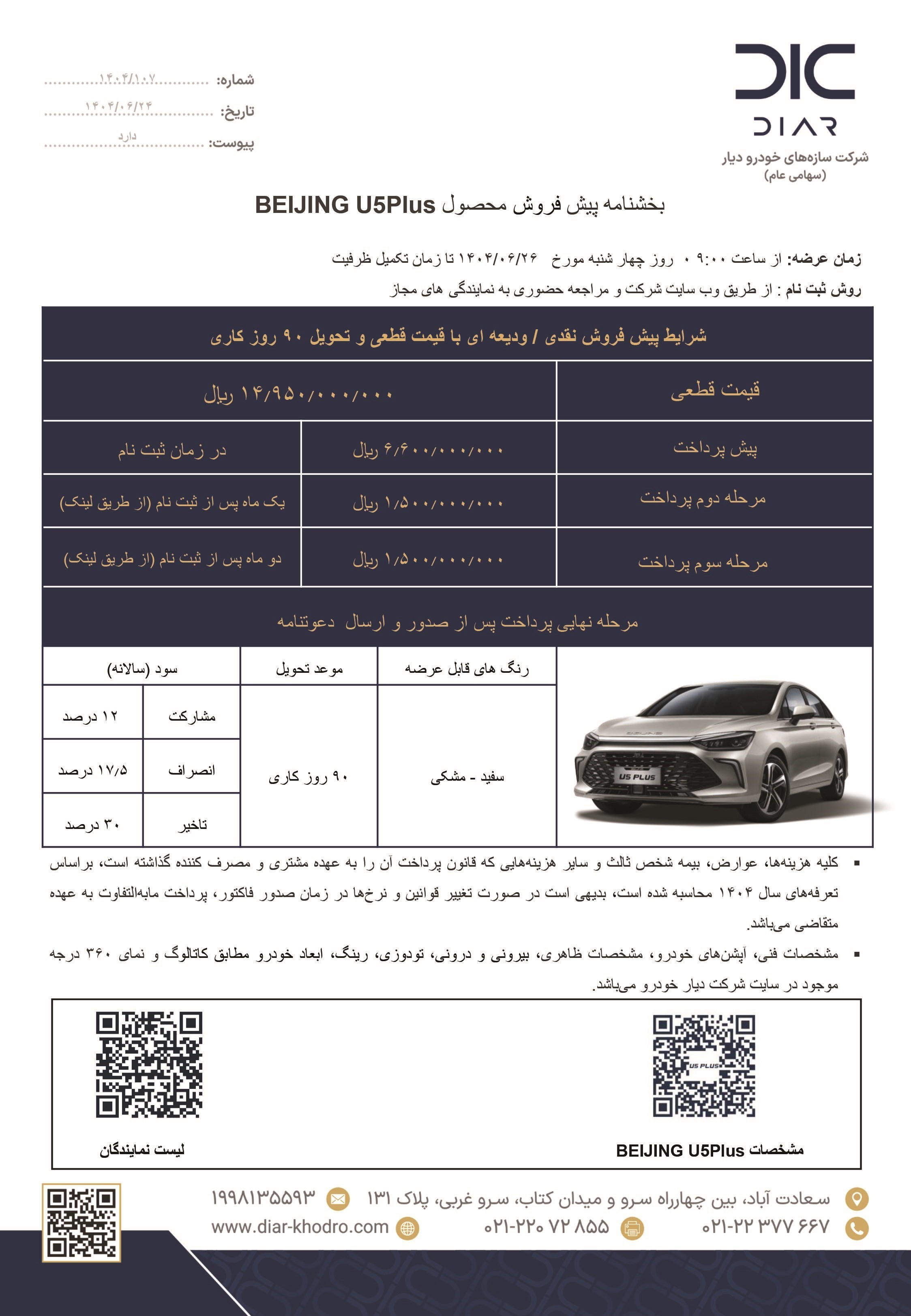 عصر خودرو- شرکت دیار خودرو بخشنامه جدید پیشفروش محصول Beijing U۵ Plus را منتشر کرد.