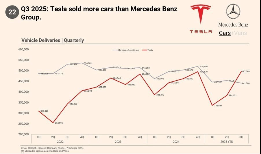به گزارش پایگاه خبری «عصر خودرو» به نقل از فارس، شرکت تسلا در پاییز 2025 موفق شد برای نخستین بار در تاریخ خود، از گروه مرسدس بنز در میزان فروش خودرو پیشی بگیرد. بر اساس آمارهای رسمی منتشرشده در7 اکتبر 2025 در گزارشهای فصلی دو شرکت تا سهماهه سوم 2025، تسلا توانسته 497 هزار و 99 دستگاه خودرو تحویل دهد؛ درحالی که مرسدسبنز در همین بازه زمانی 441 هزار و 500 دستگاه خودرو عرضه کرده است.