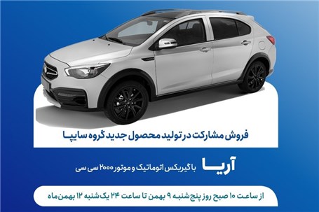 عصر خودرو- طرح فروش مشارکت در تولید خودروی جدید «آریا» از روز پنج‌شنبه ۹ بهمن‌ماه آغاز می‌شود.