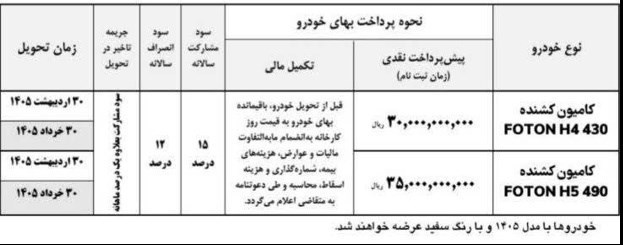 به گزارش پایگاه خبری «عصر خودرو» به نقل ازایکوپرس، در طرح فروش کامیونهای کشنده فوتون H4 و H5 محصولات با قیمت علیالحساب و همراه با شرایط پرداخت مرحلهای عرضه میشوند. موعد تحویل خودروها 30 اردیبهشت و 30 خردادماه 1405 اعلام شده است.