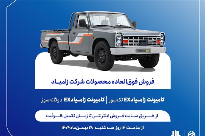 به گزارش پایگاه خبری «عصر خودرو» به نقل از سایپانیوز، شرکت زامیاد از فردا، 28 بهمن‌ماه، ساعت 14 فروش فوق‌العاده دو محصول خود را آغاز می‌کند و مشتریان می‌توانند تا زمان تکمیل ظرفیت برای خودروهای زامیاد EX تک‌سوز و زامیاد EX دوگانه‌سوز ثبت‌نام کنند.