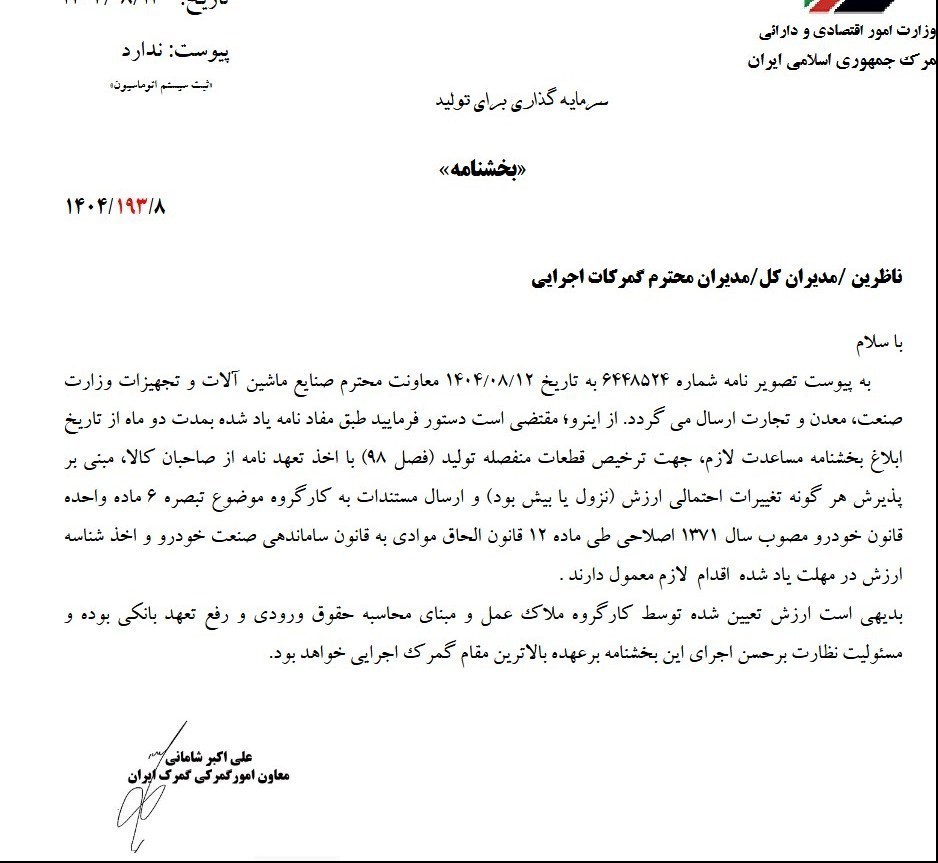 به گزارش پایگاه خبری «عصر خودرو» به نقل از تسنیم، بخشنامه جدید شامانی، معاون فنی گمرک ایران خطاب به گمرکات اجرایی کشور ابلاغ شد. بر اساس این بخشنامه، ترخیص قطعات منفصله تولید (موضوع فصل 98) با اخذ تعهدنامه از صاحبان کالا به مدت دو ماه مجاز شناخته شده است.