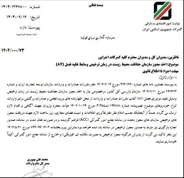 عصر خودرو- بخشنامه «لزوم اخذ مجوز سازمان محیط زیست جهت وسایط نقلیه فصل 87 اعم از واردات قطعی و صادرات برگشتی برای واردات انواع خودروها» از سوی گمرک ایران ابلاغ شد.