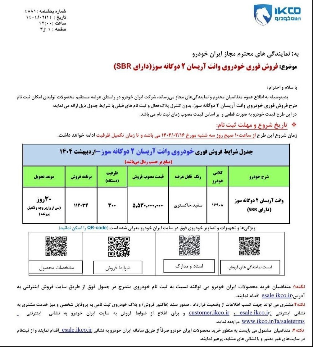 به گزارش پایگاه خبری «عصر خودرو»، فروش فوری و فوقالعاده وانت آریسان با قیمت جدید از ساعت 10 صبح سهشنبه 16 اردیبهشتماه 1404 در نمایندگیهای مجاز شرکت ایران خودرو آغاز خواهد شد.