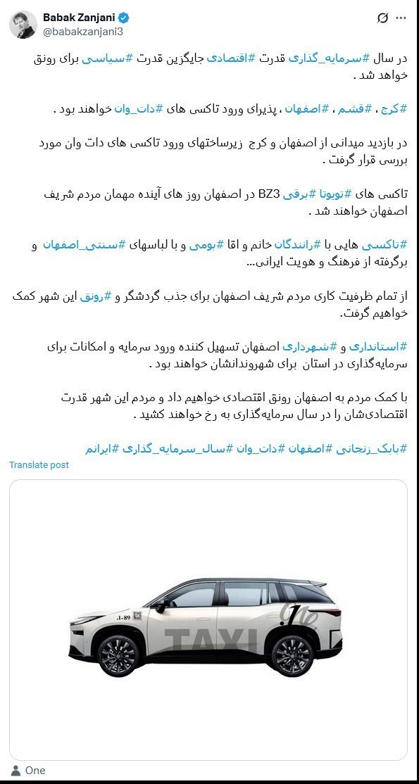 این توییت با تأکید بر جایگزینی قدرت اقتصادی بهجای سیاسی، تلاش زنجانی برای بازسازی چهره خود بهعنوان یک فعال اقتصادی را نشان میدهد. اشاره به رانندگان بومی با لباسهای سنتی اصفهان و حضور رانندگان خانم و آقا، پیامی از تعهد به فرهنگ محلی و برابری جنسیتی را منتقل میکند که میتواند برای مخاطبان جوان و گردشگران جذاب باشد. همچنین، نامبردن از استانداری و شهرداری بهعنوان حامیان پروژه، نشانهای از هماهنگی با نهادهای رسمی برای جلب اعتماد عمومی است. بااینحال، تصویری که زنجانی برای معرفی تویوتا bZ3 در توییت خود استفاده کرده، اشتباه بوده و ممکن است در شبکههای اجتماعی که کاربران بهدقت چنین جزئیاتی را بررسی میکنند، به اعتبار پروژه لطمه بزند. وی در این توییت از تصویر نسخه کراس اوور BZ3 یعنی BZ3X که به تازگی در چین معرفی شده استفاده کرده است.