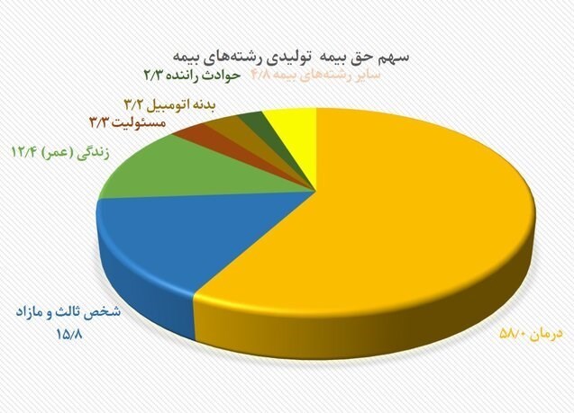 مطابق این آمار، سه رشته بیمه شخص ثالث و مازاد با سهم 15.8 درصدی به ارزش 8105 میلیارد تومان، رشته بیمه با سهم 3.2 درصدی و ارزش 1654 میلیارد تومان و رشته بیمه حوادث راننده با سهمی 2.3 درصدی به ارزش 1184 میلیارد تومان، در مجموع 21.3 درصد از سبد حق بیمه تولیدی بازار بیمه در فروردین ماه سال جاری را به خود اختصاص دادند که ارزش آن به 10 هزار و 943 میلیارد تومان میرسد.