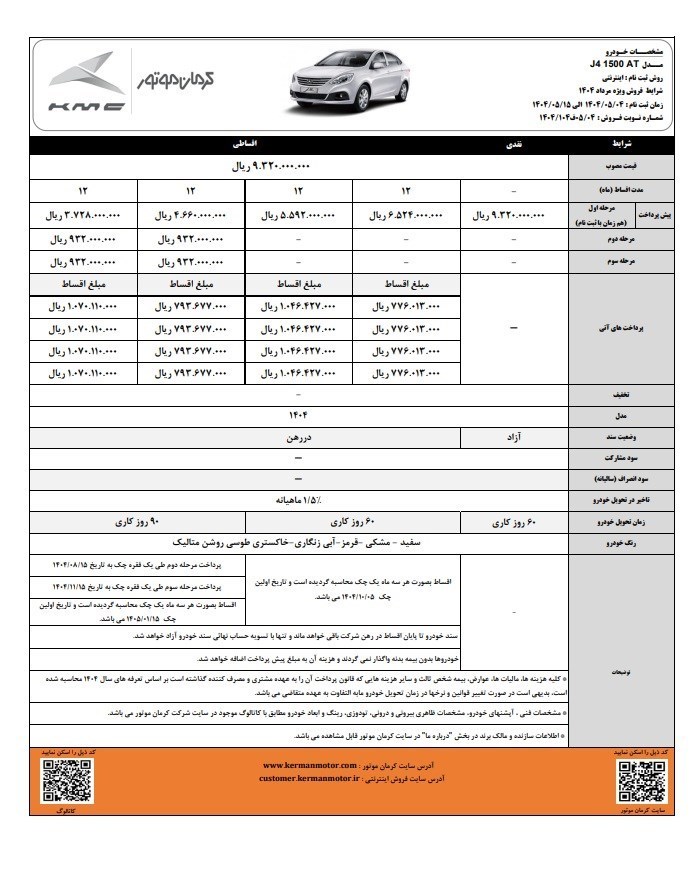 به گزارش پایگاه خبری «عصر خودرو»، بر اساس این طرح، قیمت مصوب خودروی J4 مبلغ 932 میلیون تومان تعیین شده و فروش آن به صورت نقدی و اقساط 12 ماهه انجام میشود. در شرایط فروش اقساطی، کرمان موتور انواع مدل پرداخت متنوع را در نظر گرفته که متقاضیان میتوانند یکی از آنها را انتخاب کنند.