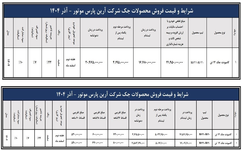 متقاضیان میتوانند جهت آگاهی از جزئیات کامل شرایط فروش کامیونت 12 تن جک و اطلاع از مراحل ثبتنام، به وبسایت رسمی آریندیزل به نشانی www.arian-diesel.com مراجعه نمایند.