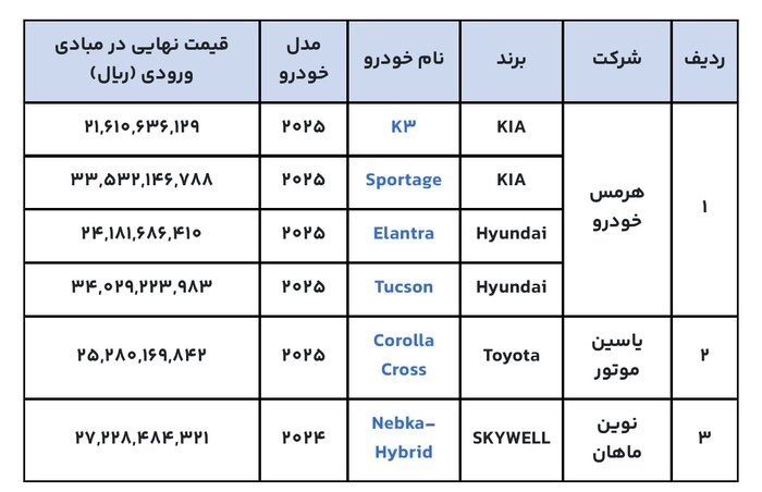 کلیه قیمت‌های مندرج در جدول، قیمت در مبادی ورودی کشور بوده و هزینه‌های بعد از ترخیص شامل بیمه شخص ثالث، شماره‌گذاری، مالیات بر ارزش افزوده، عوارض قانونی، اسقاط خودروی فرسوده، کرایه حمل و… به قیمت‌های مذکور اضافه می‌شود.